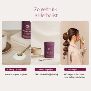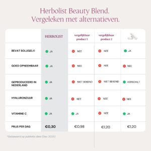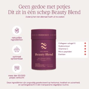 Herbolist Beauty Blend est une formule premium unique avec des micro-peptides, du collagène de type I & III + de l’acide hyaluronique + de la vitamine C. Fabriqué aux Pays-Bas selon les normes de qualité les plus strictes.