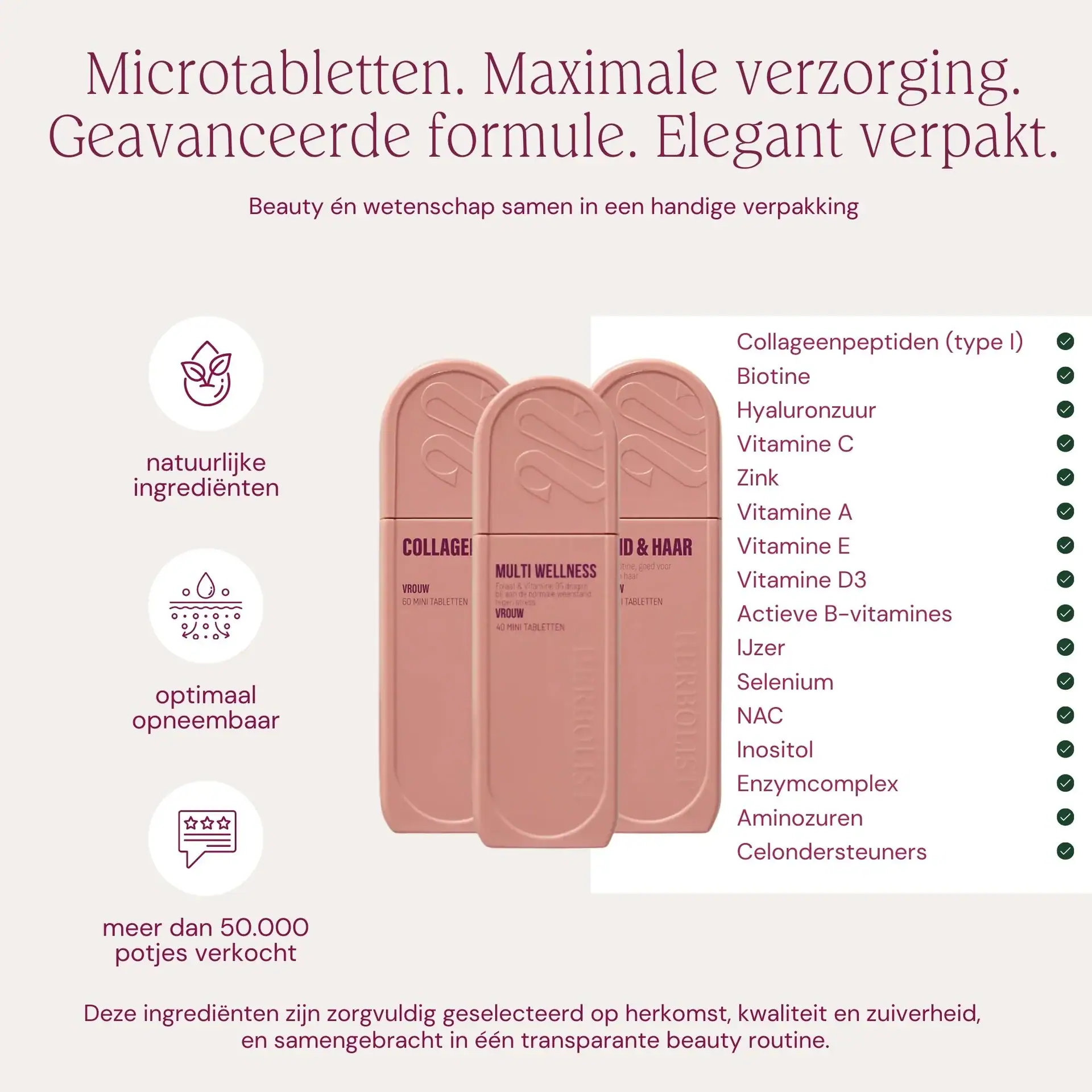 Alle formules zijn afgestemd op het vrouwenlichaam en verpakt in kleine microtabletten. Makkelijk in te nemen, prettig voor dagelijks gebruik en eenvoudig mee te nemen.