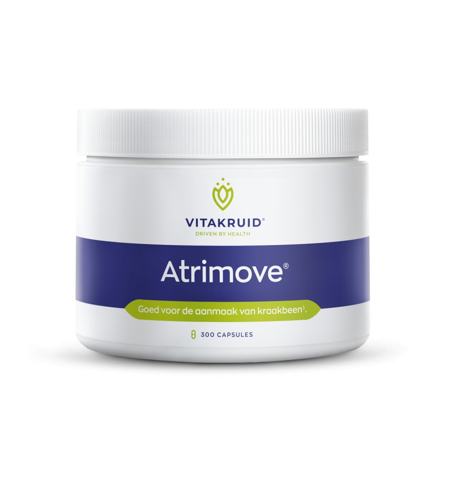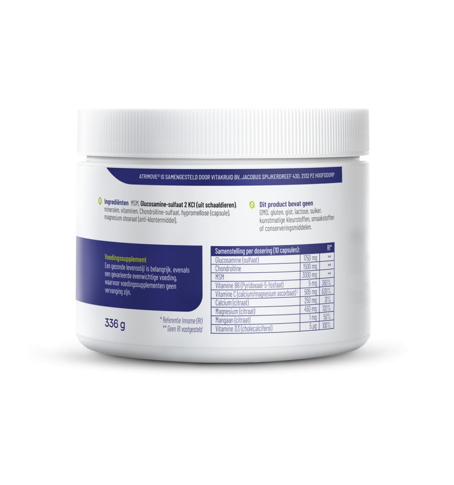Vitakruid Atrimove Capsules is a nutritional supplement that supports the functioning of the musculoskeletal system. The capsules contain a highly balanced dose of various vitamins and minerals, including calcium, magnesium and vitamin D for the maintenance of normal bones and normal muscle function. In addition, the supplement contains vitamin C, which is important for the production of collagen, which in turn ensures normal functioning of the cartilage. In addition, the supplement contains a high daily dose of active nutrients, such as glucosamine, chondroitin and MSM, which contribute to the formation of connective tissue and collagen. The supplement is also good for building strong teeth and protecting healthy cells and tissues.