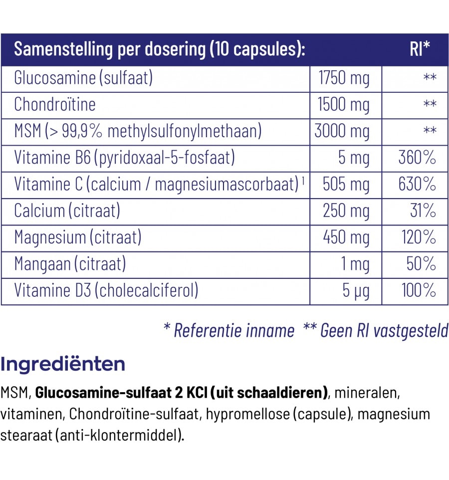 MSM, glucosaminesulfaat kaliumchloride (uit schaaldieren), chondroïtinesulfaat, hypromellose, mineralen, vitaminen, magnesium stearaat, citroenzuur (zuurteregelaar).