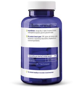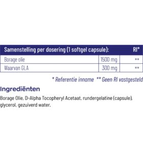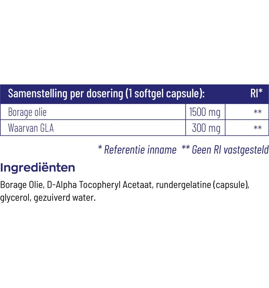 Borage Olie, D-Alpha Tocopheryl Acetaat, rundergelatine (capsule), glycerol, gezuiverd water.