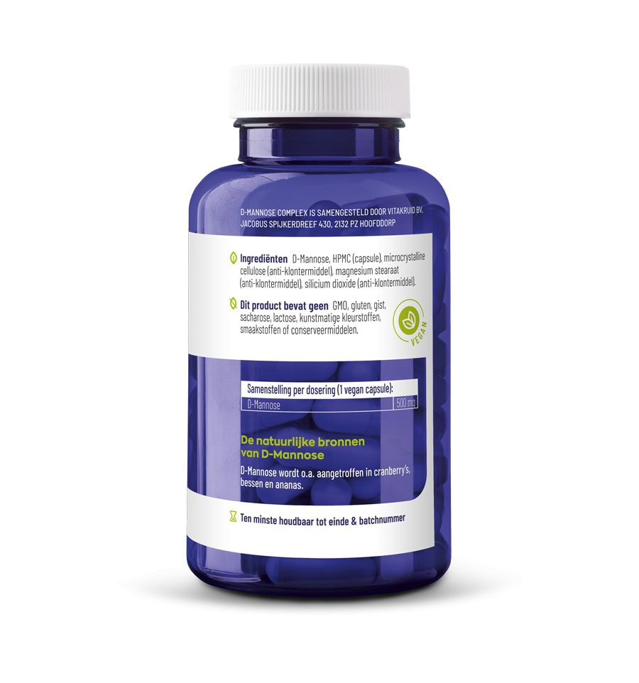 Vitakruid D-Mannose 500 is een natuurlijk supplement dat D-Mannose bevat, een suikervariant die in kleine hoeveelheden voorkomt in vruchten zoals cranberry en ananas. Het supplement bevat een hoge dosering D-Mannose per capsule en is geconcentreerder dan cranberry’s, wat betekent dat het een krachtiger effect heeft. Het extractieproces dat gebruikt wordt bij de productie van Vitakruid D-Mannose 500 is van hoogwaardige kwaliteit, waardoor de efficiëntie van het supplement verder wordt versterkt.