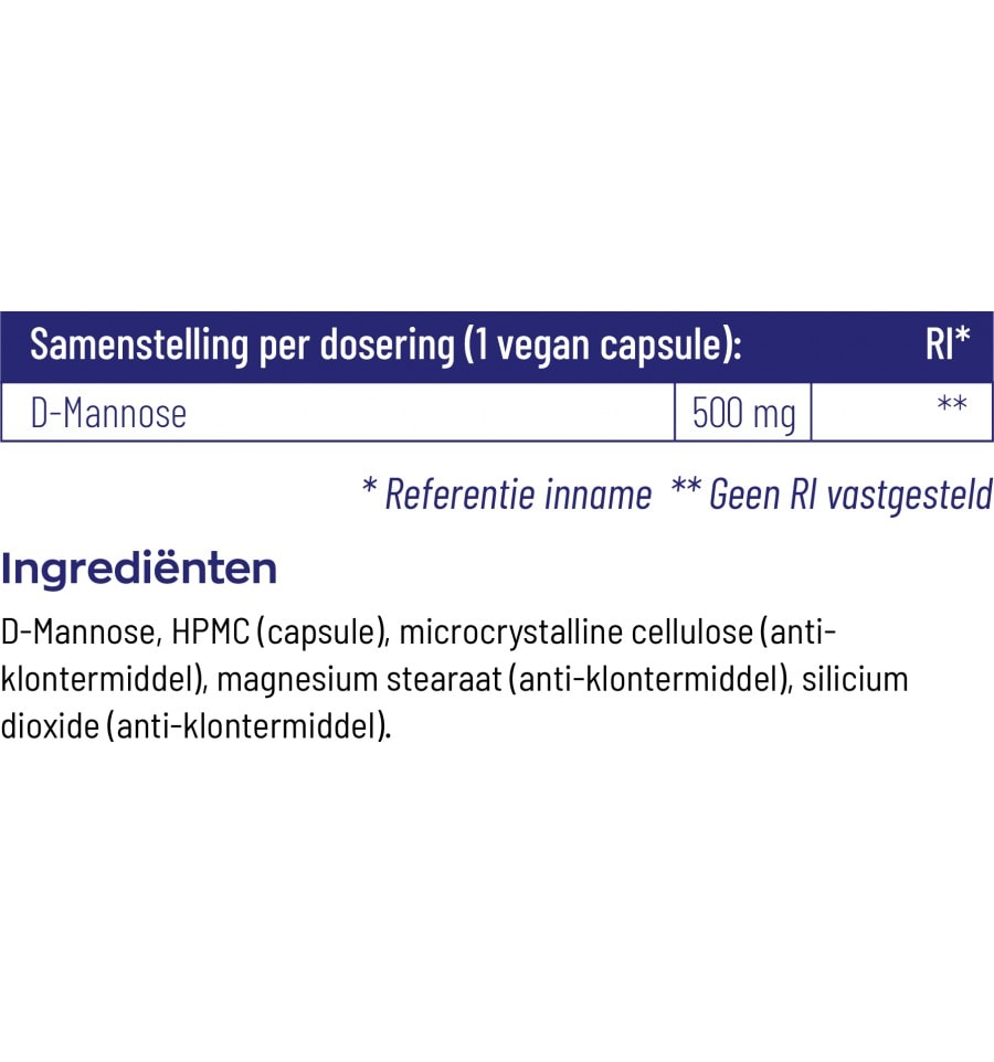 D-Mannose, HPMC (capsule), cellulose (vulstof), silicium dioxide (anti-klontermiddel).