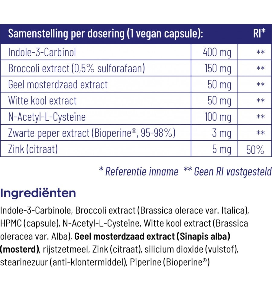 Indole-3-Carbinole, Broccoli extract (Brassica olerace var. Italica), HPMC (capsule), N-Acetyl-L-Cysteïne, Witte kool extract (Brassica oleracea var. Alba), Geel mosterdzaad extract (Sinapis alba) (mosterd), rijstzetmeel, Zink (citraat), silicium dioxide (vulstof), stearinezuur (anti-klontermiddel), Piperine (Bioperine®).