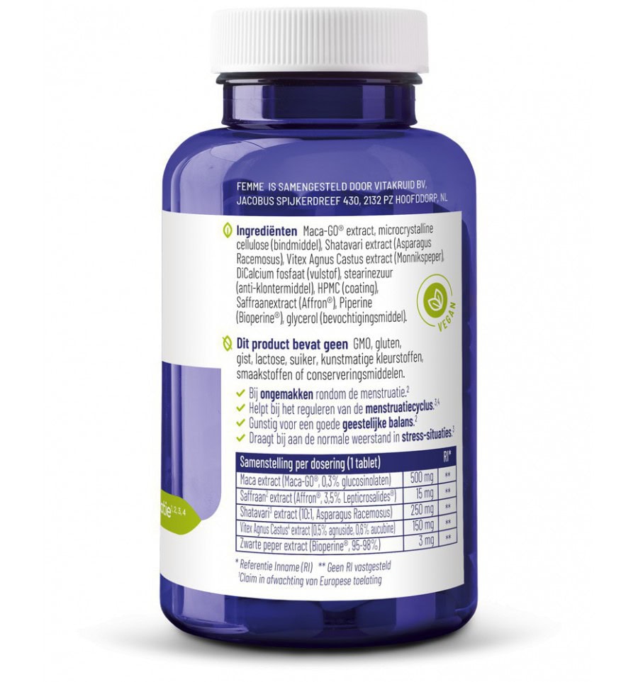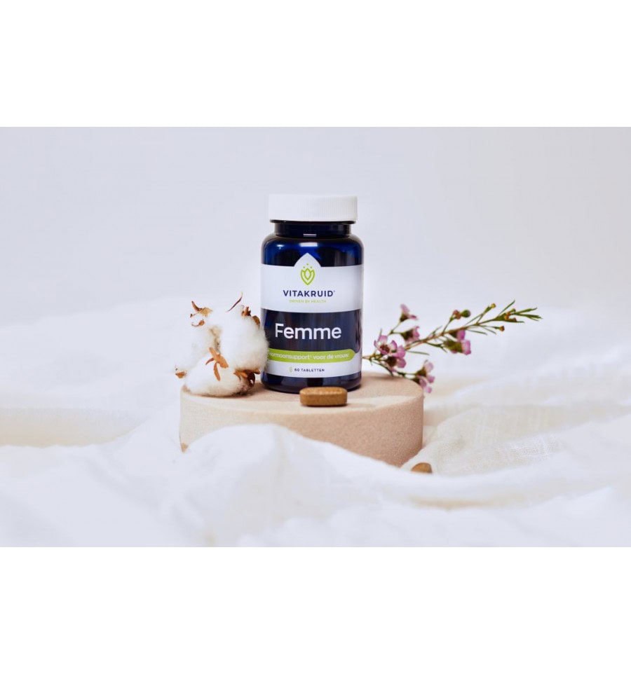 Femme is een kruidenpreparaat speciaal voor vrouwen. Dit supplement bevat onder andere Shatavari, Maca, Vitex Agnus Castus en Saffraan, die allemaal hun eigen voordelen hebben voor de vrouwelijke gezondheid. Zo kan Shatavari helpen bij ongemakken rondom de menstruatie, de mannelijke potentie ondersteunen en een gunstige invloed hebben op de slaapfunctie. Maca is goed voor het energieniveau en draagt bij aan normale mentale prestaties, terwijl Vitex Agnus Castus bijdraagt aan de normale hormoonhuishouding en de weerstand tegen stress. Saffraan is goed voor de geestelijke balans en werkt ontspannend.