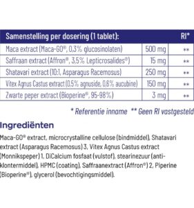 Waarschuwing: Dit product bevat Maca extract, Saffraan extract, Shatavari extract, Vitex Agnus Castus extract en Zwarte peper extract. Raadpleeg een arts voordat u dit product gebruikt als u zwanger bent, borstvoeding geeft, medicijnen gebruikt of een medische aandoening heeft. Stop het gebruik en raadpleeg een arts als er bijwerkingen optreden. Niet bedoeld voor personen onder de 18 jaar. Buiten bereik van kinderen houden. Overmatig gebruik kan een laxerend effect hebben. Gebruik dit product niet als de verzegeling verbroken is.