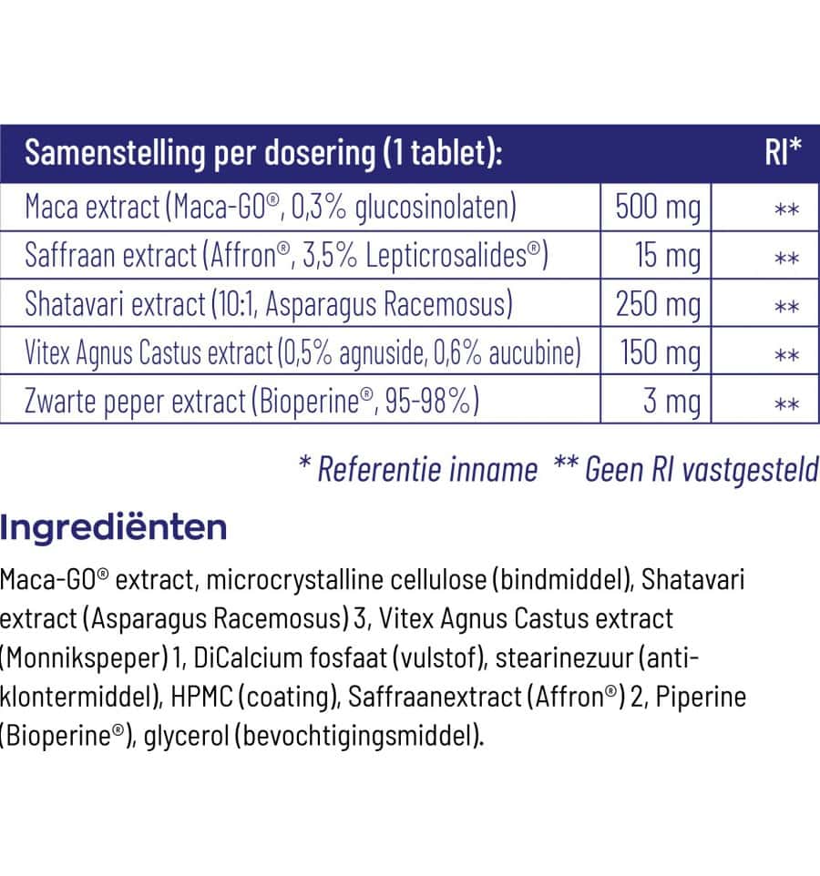Maca-GO® extract, microcrystalline cellulose (bindmiddel), Shatavari extract (Asparagus Racemosus), Vitex Agnus Castus extract (Monnikspeper), DiCalcium fosfaat (vulstof), stearinezuur (anti-klontermiddel), HPMC (coating), Saffraanextract (Affron®), Piperine (Bioperine®), glycerol (bevochtigingsmiddel)