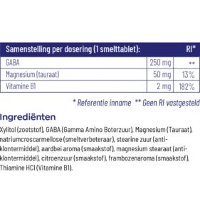 GABA (Gamma Amino Boterzuur), magnesiumtauraat, vitamine B1, xylitol (zoetstof), natuurlijke aroma’s, hydroxypropylcellulose, silicium dioxide (vulstof), magnesiumstearaat (antiklontermiddel).