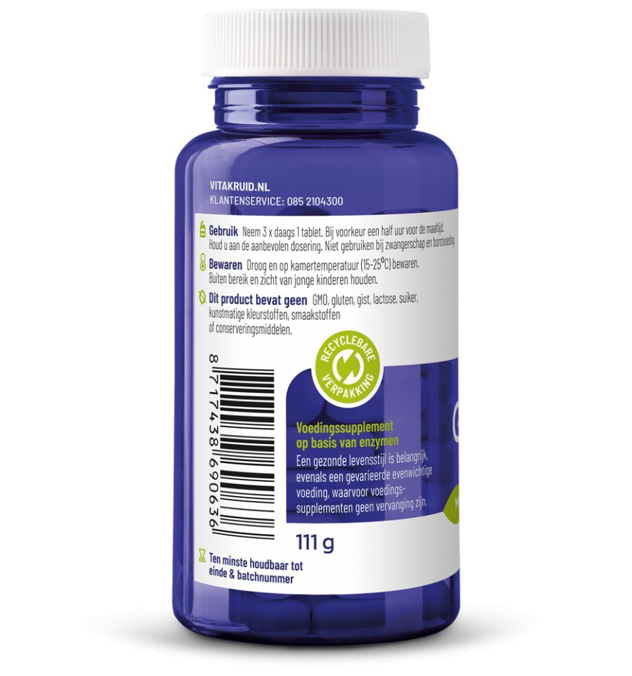 Vitakruid Glutazyme Enzymen is een vooruitstrevend voedingssupplement dat een uitgebalanceerde formule bevat van het aminozuur L-Glutamine, 6 verschillende enzymen, het probiotische Lactospore en de flavonoïde rutine. Deze combinatie van ingrediënten maakt dit supplement een krachtige spijsverteringsformule. Glutamine is een aminozuur dat bij veel stofwisselingsprocessen een belangrijke rol speelt en kan bij stress of zware fysieke inspanning semi-essentieel worden. De verschillende enzymen en Lactospore die aan dit supplement zijn toegevoegd, ondersteunen de werking van glutamine en zorgen voor een optimale spijsvertering.