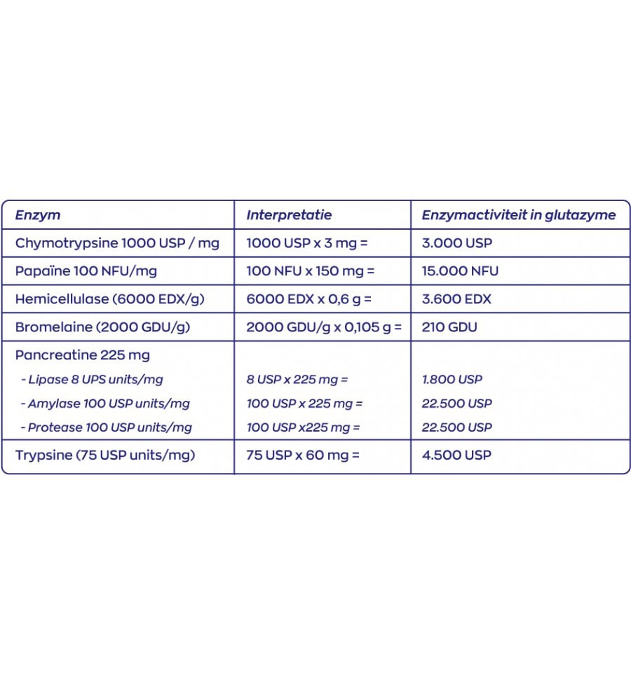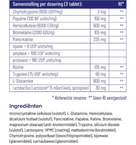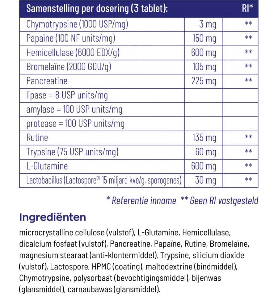 L-Glutamine, Hemicellulase, Dicalcium fosfaat (E 341b), Microkristallijne cellulose (vulmiddel), Rutine, Bromelaïne, magnesium stearaat (anti-klontermiddel), Lactospore, Maltodextrine (vulmiddel), Pancreatine, Bijenwas (glansmiddel), Papaïne, Trypsine, Chymotrypsine.