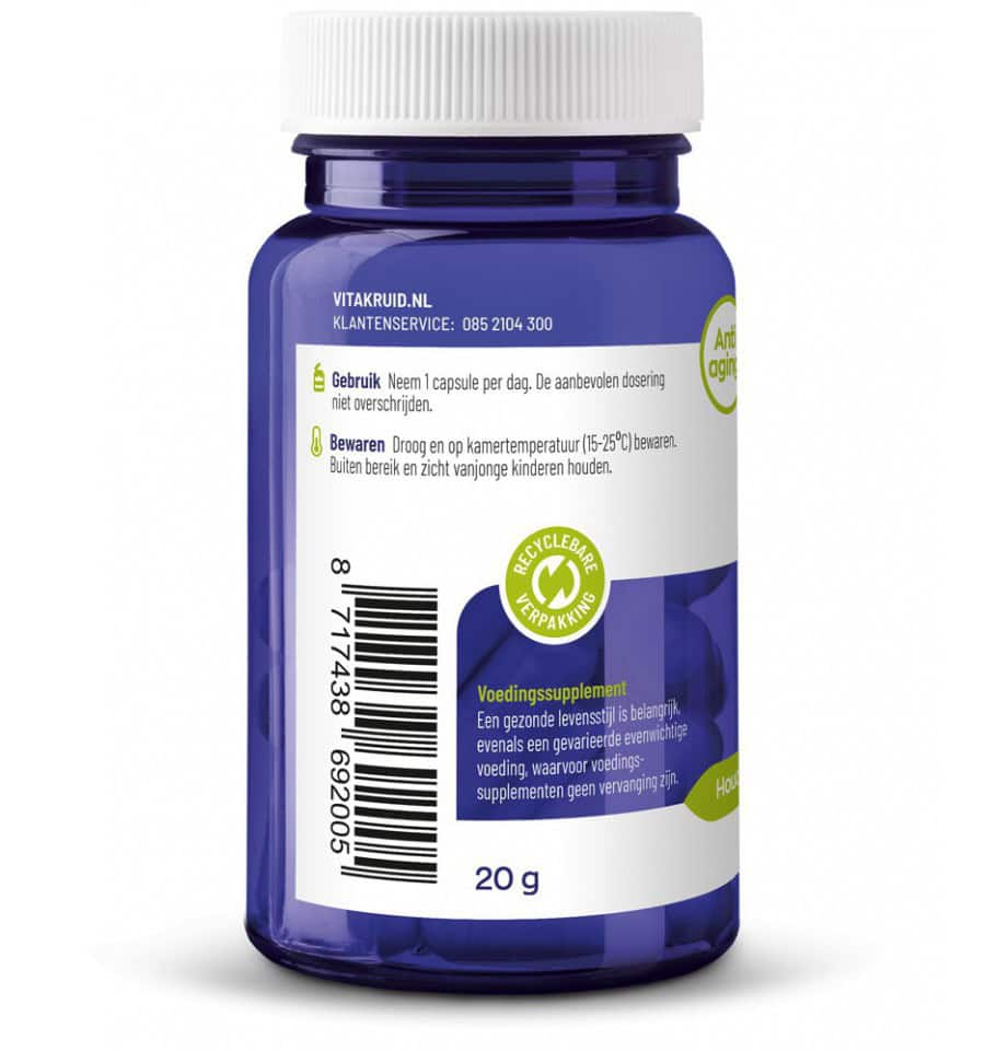 This dietary supplement provides a natural solution to reduce the signs of aging and make the skin look younger and more radiant. Due to hyaluronic acid’s ability to retain water, it can hydrate the skin from within and improve its elasticity and suppleness. This supplement is also suitable for people suffering from dry skin or other skin conditions associated with a lack of moisture. In addition, using hyaluronic acid is safer than using synthetic creams and ointments, because it occurs naturally in our body. In short, Vitakruid Hyaluronic Acid 150 Capsules is an excellent way to nourish and care for the skin from within, thus reducing the signs of aging.