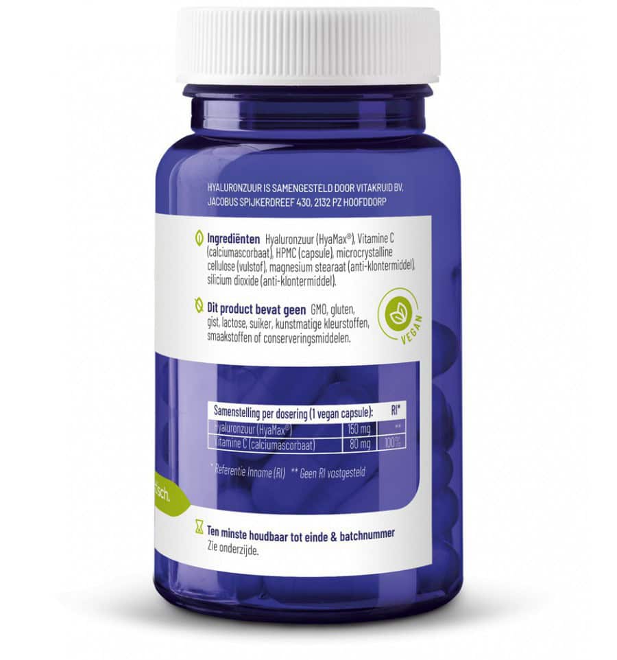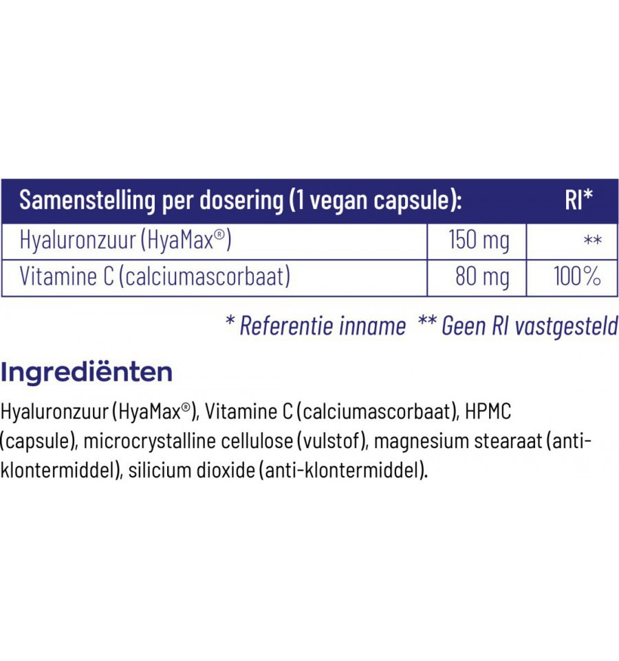 Hyaluronzuur (HyaMax®), Vitamine C (calciumascorbaat), HPMC (capsule), microcrystalline cellulose (vulstof), magnesium stearaat (anti-klontermiddel), silicium dioxide (anti-klontermiddel)