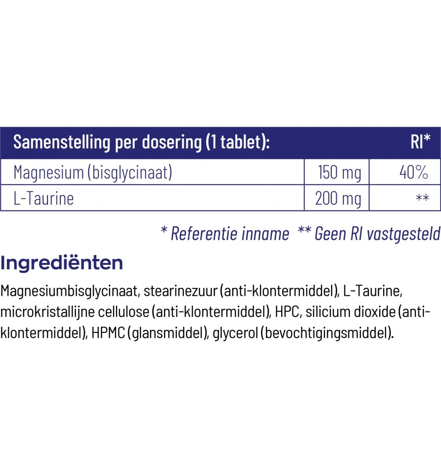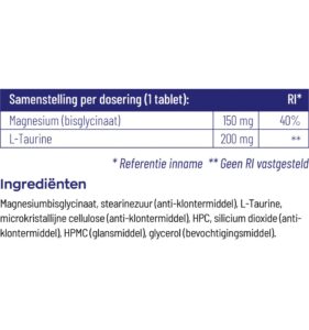 Magnesiumbisglycinaat, L-Taurine, HPMC (vega capsule), zonnebloem lectithine (flow verbeteraar), aardappelzetmeel (vulstof), zonnebloemolie (flow verbeteraar).