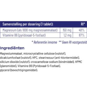 Door de toevoeging van vitamine B6 aan magnesium verbetert de opname van het mineraal. Bovendien heeft vitamine B6 meerdere wetenschappelijke onderbouwde gezondheidsbevorderende eigenschappen. Deze vitamine is bijvoorbeeld goed voor de aanmaak van rode bloedcellen, de eiwitproductie en cysteïne aanmaak.* Door te kiezen voor Pyridoxaal-5-fosfaat (de biologische actieve, co-enzymatische vorm van vitamine B6) realiseren we een hogere biologische beschikbaarheid die tevens veiliger is dan andere vormen van B6.