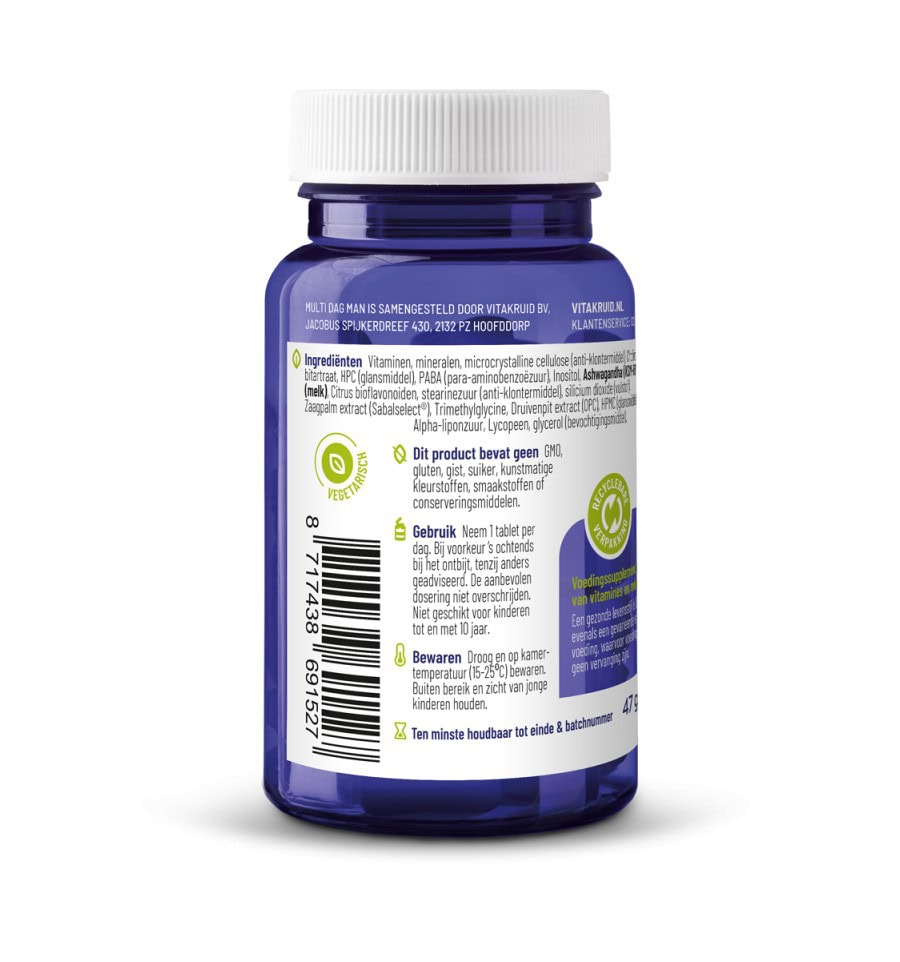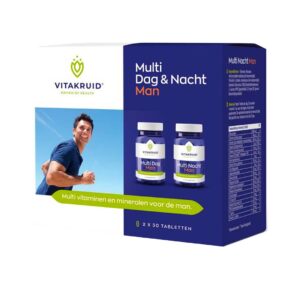 Vitakruid Multi Dag & Nacht Man Tabletten is een voedingssupplement dat speciaal is ontworpen om mannen overdag vol energie te houden en ‘s nachts tot rust te laten komen. De Multi Dag Man bevat biologisch beschikbare vormen van vitamine B en Zaagpalm extract Sabalselect®, dat ondersteuning biedt aan de natuurlijke haargroei en het behoud van de voortplantingsorganen. Ashwagandha KSM 66® helpt bij de opbouw van spieren en uithoudingsvermogen, terwijl het lichaam tegelijkertijd weerbaar wordt gemaakt tegen stressvolle situaties. De formule bevat ook Zink methionine en SeleenSeLECT®, die goed zijn voor het sperma.