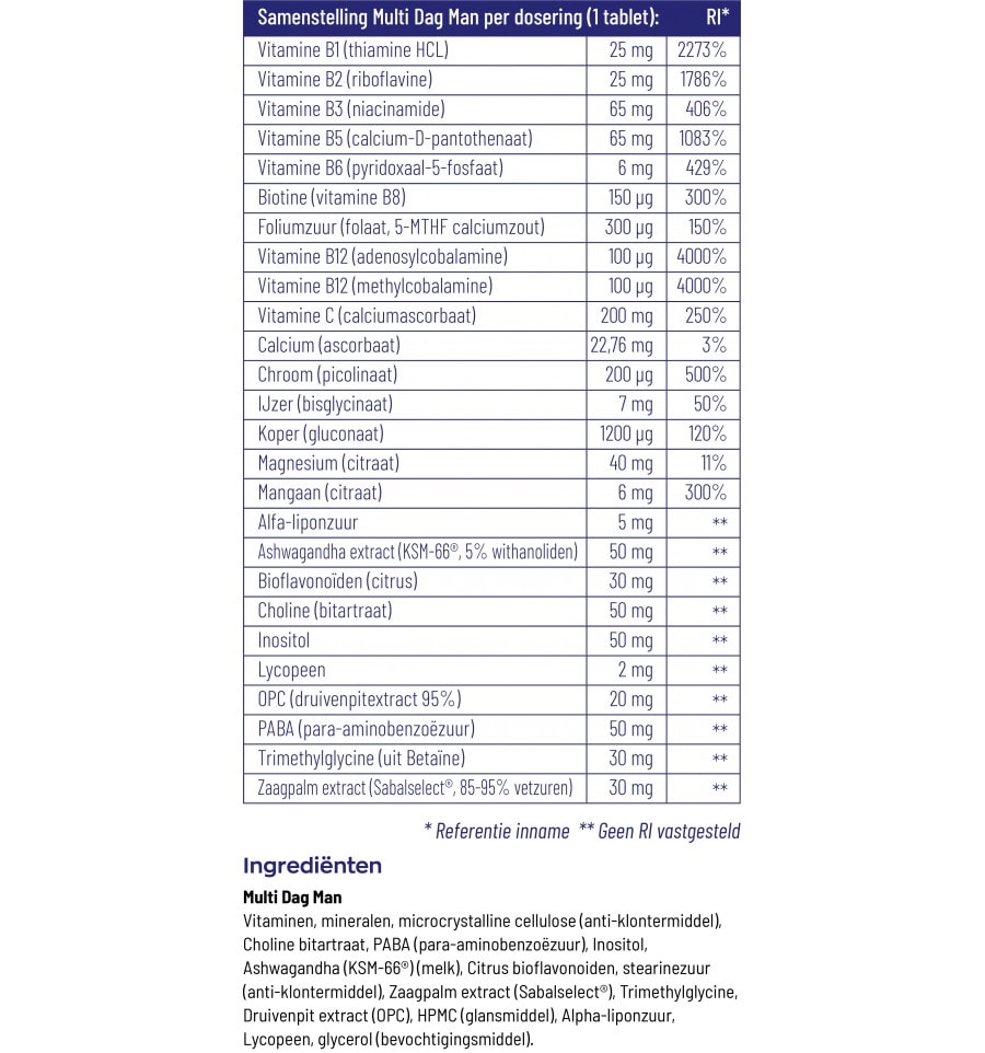 Vitaminen, mineralen, microcrystalline cellulose (anti-klontermiddel), Choline bitartraat, PABA (para-aminobenzoëzuur), Inositol, Ashwagandha (KSM-66®) (melk), Citrus bioflavonoiden, stearinezuur (anti-klontermiddel), Zaagpalm extract (Sabalselect®), Trimethylglycine, Druivenpit extract (OPC), HPMC (glansmiddel), Alpha-liponzuur, Lycopeen, glycerol (bevochtigingsmiddel).