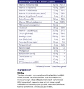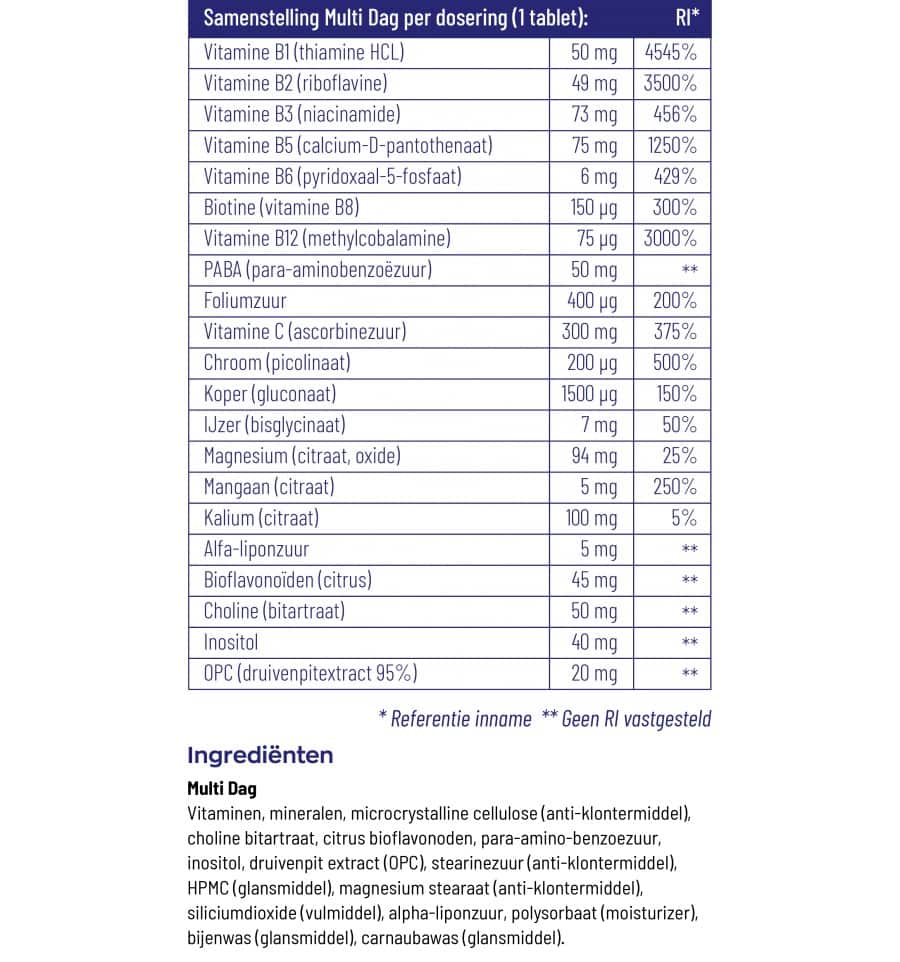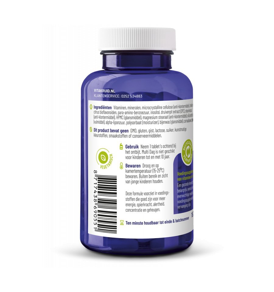 Vitakruid Multi Dag bevat een uitgekiende formule met vitaminen en mineralen die speciaal zijn afgestemd op het bioritme van het menselijk lichaam. Het supplement ondersteunt de stofwisseling en draagt bij aan het verminderen van vermoeidheid. Daarnaast bevat het supplement andere nutriënten zoals OPC om de werking van andere voedingsstoffen te verbeteren. De veiligste vorm van Vitamine B6 (P-5-P) is aanwezig in het supplement en het actieve B-complex draagt bij aan een goede gezondheid.