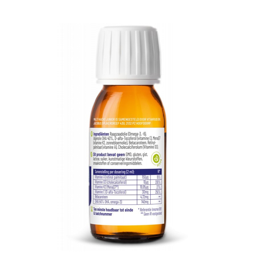 Vitakruid Multi Nacht Junior heeft verschillende voordelen. Het ondersteunt de psychologische en fysieke gesteldheid van uw kind ‘s nachts en draagt bij aan een optimale visuele ontwikkeling van zuigelingen tot de leeftijd van 12 maanden. Het bevat vitamine D voor de opbouw van sterke botten en vitamine A voor het herstellend vermogen van de huid. Daarnaast bevat het een hoge concentratie DHA uit veganistische bron, wat een ondersteunend effect heeft op de leerprestatie en concentratie tijdens de vroege levensjaren. Vitamine K2 en D hebben gezamenlijk een essentiële rol bij het behouden van een gezonde calciumstofwisseling.