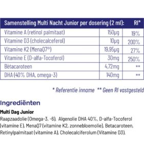 A major advantage of Vitakruid Multi Nacht Junior is that it offers a unique concept of a Multi and Omega in one. So it is not necessary to buy two separate supplements. In addition, the DHA comes from a vegan source, making the product suitable for children with an allergy to fish. The supplement is also free from allergens, including soy. Vitakruid Multi Nacht Junior has also been approved by the European Food Safety Authority and has various health claims, such as that DHA contributes to optimal visual development of infants up to the age of 12 months and that vitamin D is good for the calcium levels in the blood and the skeleton. of children, the absorption of calcium, the cell division process, children’s resistance, teeth and muscles. This makes the supplement a valuable addition to the diet of children who need extra support during the night.
