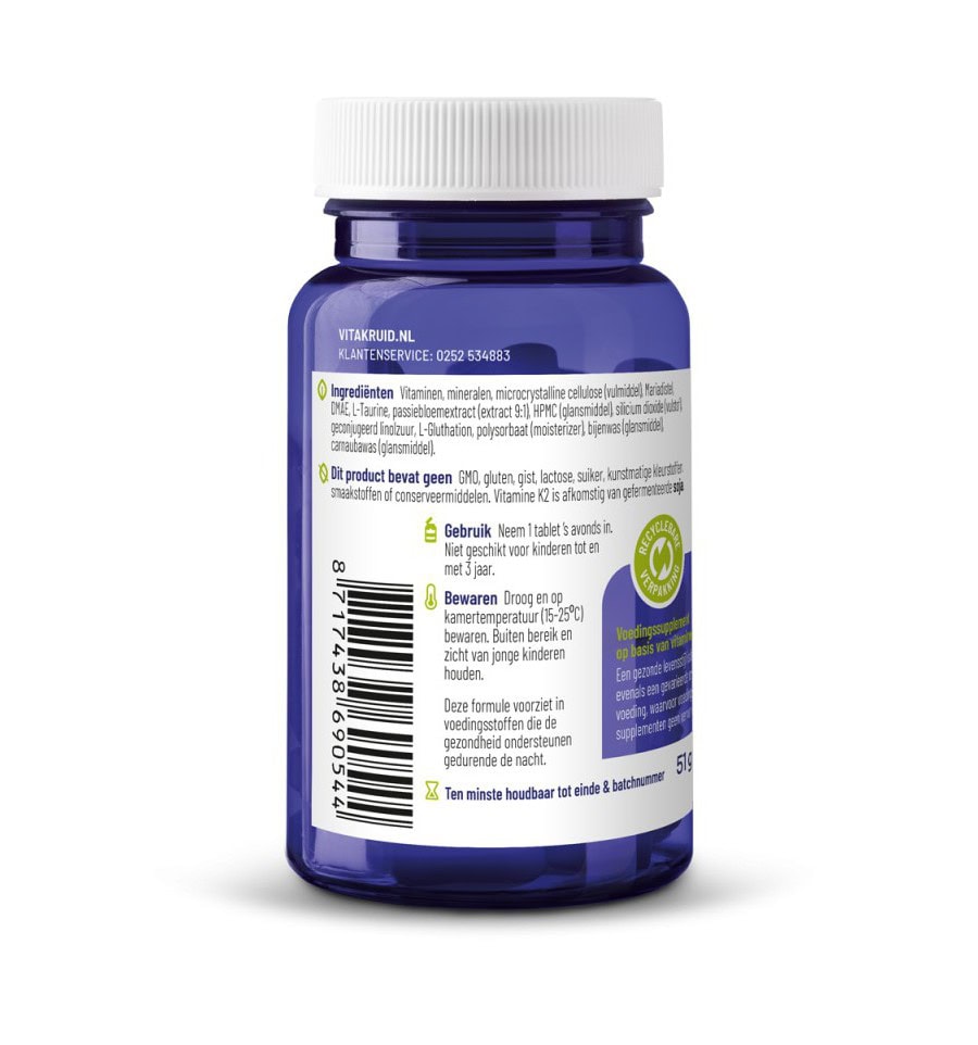 Vitakruid Multi Night is a special multi-preparation that focuses on our biorhythm and the nutrients that the human body needs at night. The supplement contains fat-soluble vitamins and minerals that are necessary for the building processes that mainly take place at night. The product contains vitamin A, beta-carotene, D3, F, K2 and Ascorbyl palmitate, all of which have an antioxidant effect. Minerals such as calcium, magnesium, iron and zinc, together with vitamin D, support the cell division process and cell renewal. In addition, the supplement also contains passion flower extract to induce rest and sleep and milk thistle for natural support of the liver and gallbladder.