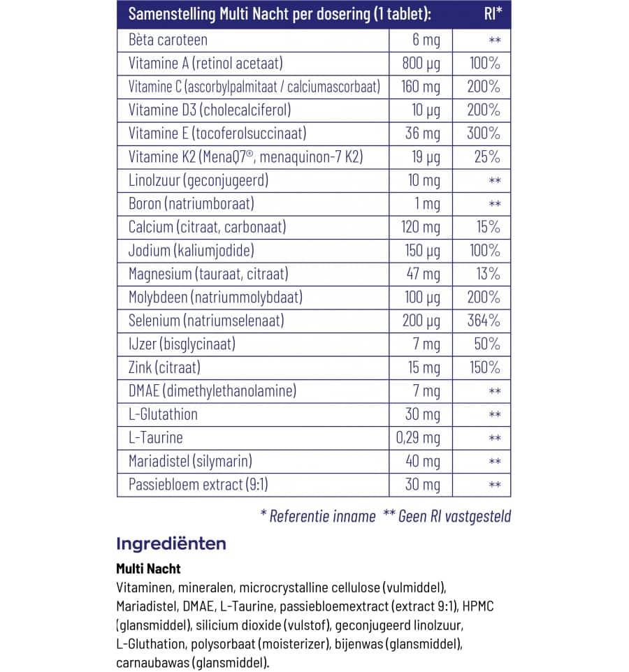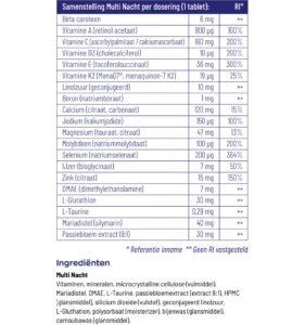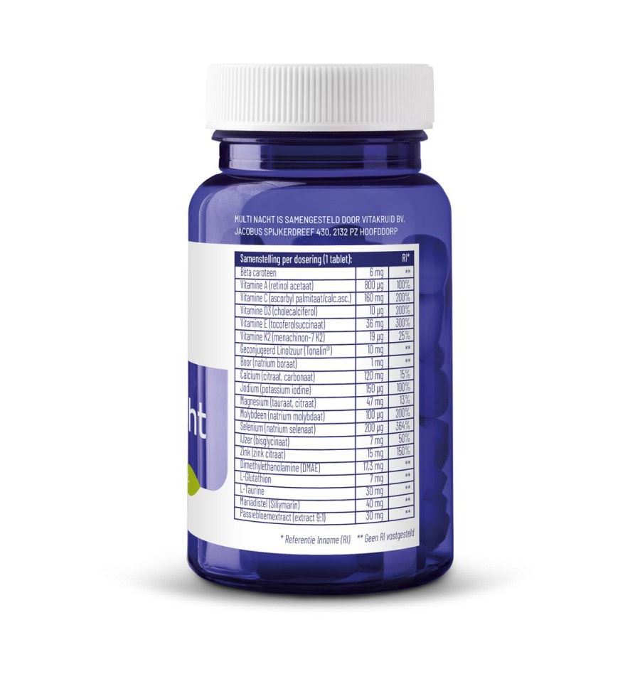 Vitakruid Multi Nacht bevat verschillende vitaminen en mineralen die goed zijn voor je lichaam. Zo ondersteunt het onder andere het celdelingsproces, de bloedstolling, de botten en het skelet, het gebit en het energiemetabolisme. Bovendien bevat het preparaat passiebloemextract, dat kan helpen om rust en slaap op te wekken. Melatonine, een hormoon dat een rol speelt bij de regulatie van het slaap-waakritme, is ook aanwezig in de formule.