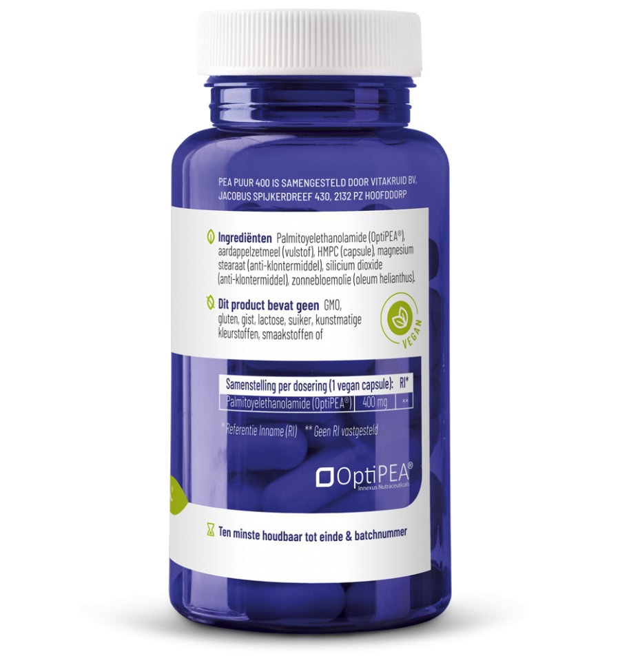 OptiPEA® is het enige gepatenteerde PEA-extract op de Nederlandse markt en heeft een ultrafijne deeltjesgrootte voor optimale opname. Het extract wordt gewonnen uit duurzame palmolie met een RSPO-keurmerk, wat betekent dat het afkomstig is van duurzame bronnen. Het gebruik van Vitakruid PEA Puur 400 kan bijdragen aan een gezondere levensstijl en ons lichaam ondersteunen bij het behouden van een optimale gezondheid. De voordelen van PEA zijn onder andere het verminderen van ontstekingen, pijnverlichting en het ondersteunen van een gezond immuunsysteem. Het gebruik van OptiPEA® kan ervoor zorgen dat deze voordelen optimaal worden benut, waardoor het supplement nog effectiever wordt.