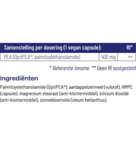 Vitakruid PEA Puur 400 geformuleerd met OptiPEA is een hoogwaardig supplement dat het natuurlijk functioneren van het lichaam ondersteunt en ons welbevinden kan vergroten. PEA is een lichaamseigen stof die samenwerkt met de lichaamseigen biochemie. Het kan helpen bij het verminderen van pijnklachten en het verbeteren van de stemming. Daarnaast heeft dit product een ultra fijne deeltjesgrootte voor optimale opname en is het gewonnen uit duurzame palmolie voorzien van een RSPO keurmerk.