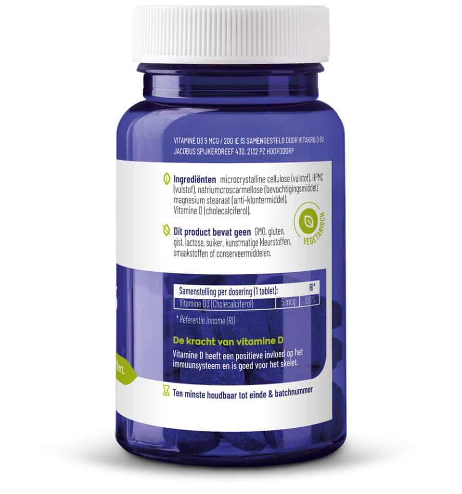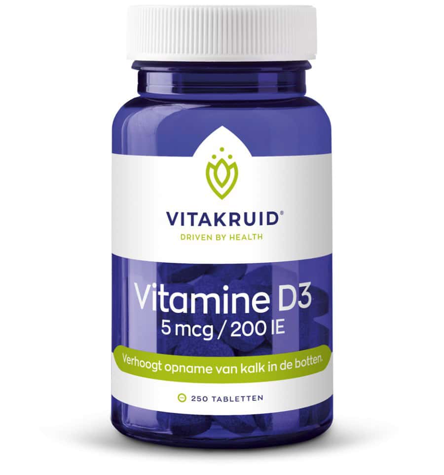 Vitamin D is an essential vitamin that helps absorb calcium and phosphorus and contributes to the normal functioning of muscles and the maintenance of normal bones. Seniors and people with dark skin are recommended to take extra vitamin D for stronger bones. In addition, vitamin D has a positive effect on the immune system. Vitakruid Vitamin D3 5mcg is a highly bioavailable form of vitamin D3. It is a small tablet that ensures optimal ease of swallowing and the low dosage makes a specific approach possible. The tablet has numerous health-promoting effects and contributes to good calcium levels in the blood, bone production and the maintenance of strong bones.