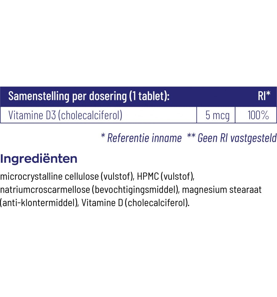 | Vitamine D3 (cholecalciferol) | 5 mcg | 100% |