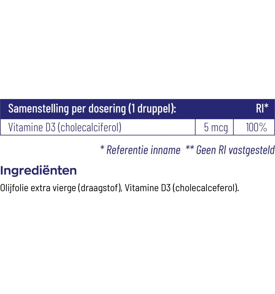 | Vitamine D3 (cholecalciferol) | 5 mcg | 100% |
