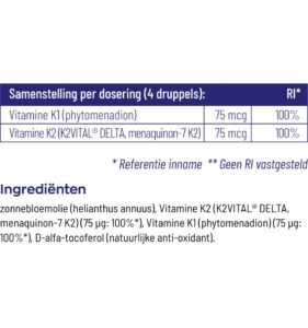De Vitamine K Baby druppels bevatten zowel Vitamine K1 (phytomenadion) als Vitamine K2 (K2VITAL® DELTA, menaquinon-7 K2) in een dosering van 75 μg per dagdosering van 4 druppels.