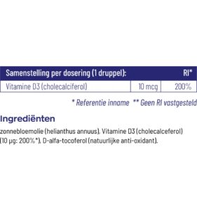 Vitamine D Baby druppels: Zonnebloemolie (draagstof), Vitamine D3 (cholecalceferol), D-alfa-tocoferol (natuurlijke anti-oxidant)