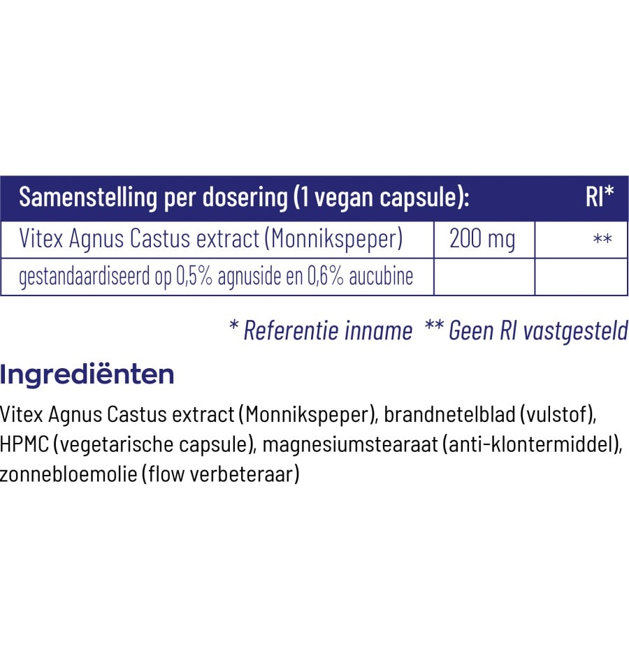 Vitex Agnus Castus extract (Monnikspeper), brandnetelblad (vulstof), HPMC (vegetarische capsule), magnesiumstearaat (anti-klontermiddel), zonnebloemolie (flow verbeteraar)
