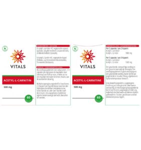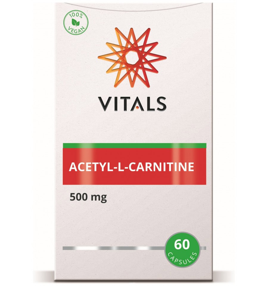 Vitals Acetyl-L-Carnitine is een veganistisch supplement met het semi-essentiële aminozuur Acetyl-L-Carnitine (ALCAR), dat van nature voornamelijk in (rood) vlees voorkomt. Dit aminozuur kan echter ook in de hersenen worden gevormd uit de aminozuren lysine en methionine, mits er voldoende co-factoren aanwezig zijn. Vitamine C, vitamine B6, ijzer en niacine zijn belangrijke co-factoren voor de productie van ALCAR in het lichaam. Door het gebruik van Vitals Acetyl-L-Carnitine kan een tekort aan ALCAR in het dieet van vegetariërs en veganisten worden aangevuld. Het supplement wordt geleverd in een plantaardige capsule, aangevuld met een hulpstof uit natuurlijke bron.