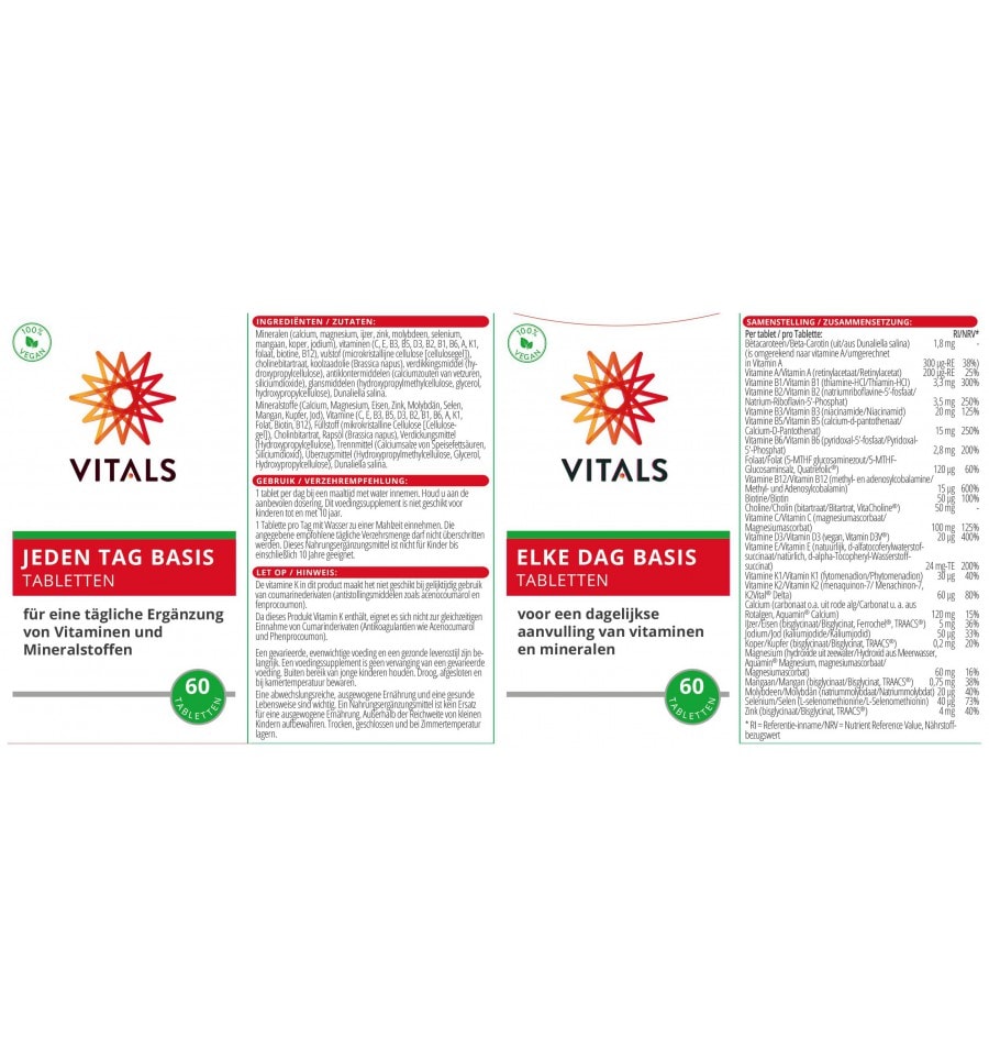 Naast de B-vitaminen bevat Vitals Elke Dag Tabletten ook hoge doses vitamine D3 en K2. Vitamine D is een essentiële voedingsstof die een rol speelt bij de opname van calcium en fosfor in het lichaam, wat belangrijk is voor de gezondheid van de botten en tanden. Vitamine K2 werkt samen met vitamine D3 om calcium op de juiste plekken in het lichaam te brengen, zoals de botten en tanden, in plaats van het te laten ophopen in de bloedvaten.