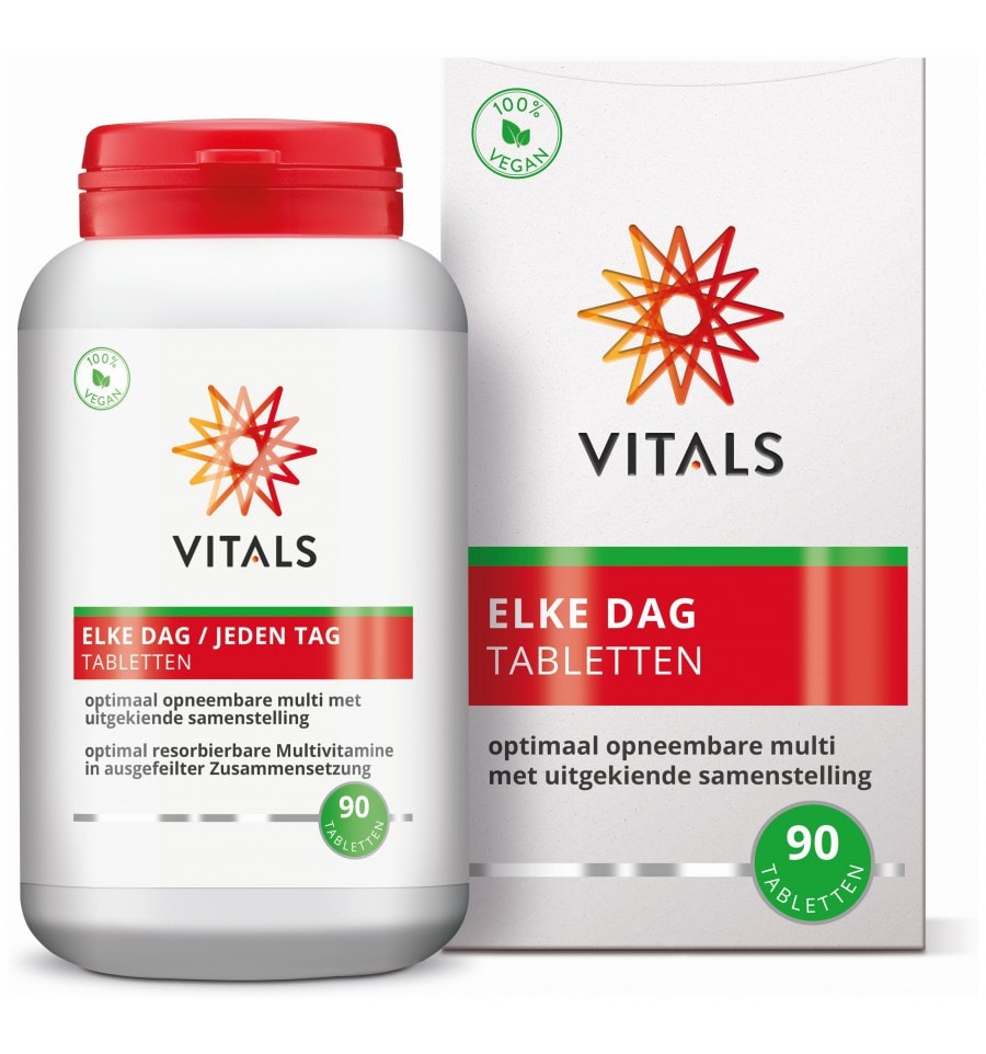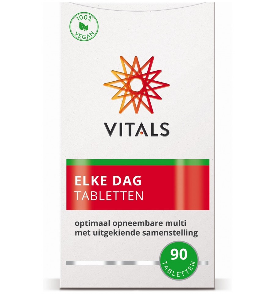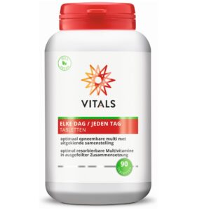 Vitals Elke Dag Tabletten bevat een uitgekiende samenstelling van vitamines en mineralen die bijdragen aan een gezonde levensstijl. Het bevat onder andere verantwoorde doseringen van B-vitaminen in biologisch actieve vorm, vitamine D3 en K2, calcium en magnesium uit natuurlijke bron en een citrusbioflavonoïdencomplex. De multi ondersteunt het energieniveau, kan helpen bij vermoeidheid, heeft een positieve invloed op het immuunsysteem, beschermt de cellen tegen oxidatieve schade en ondersteunt het zenuwstelsel en mentale functies.