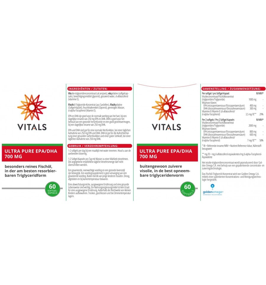 Vitals Ultra pure EPA/DHA 700mg is geschikt voor volwassenen die de normale werking van het hart, gezonde hersenfunctie en een goed gezichtsvermogen willen ondersteunen.