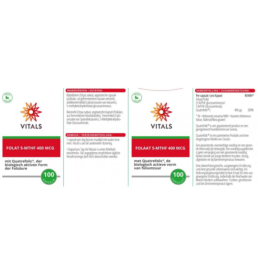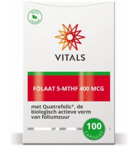 Vitals Folaat 5-mthf 400mg Capsules is een voedingssupplement dat een aanbevolen dosering folaat bevat, speciaal ontwikkeld voor vrouwen voorafgaand aan en tijdens de zwangerschap. Folaat is een essentiële vitamine die bijdraagt aan een normale celdeling, de normale werking van het immuunsysteem en de aanmaak van rode en witte bloedcellen. Het probleem is dat niet alle vormen van folaat goed door het lichaam worden opgenomen. Daarom maakt deze capsule gebruik van Quatrefolic, een vorm van folaat gebonden aan glucosaminezout, die beter opneembaar is. Deze capsules zijn geschikt voor vegetariërs en veganisten en bevatten een plantaardige capsule met hulpstoffen uit natuurlijke bron. Het voedingssupplement kan ook helpen bij het verminderen van vermoeidheid en is belangrijk voor normale hersen- en zenuwfuncties.