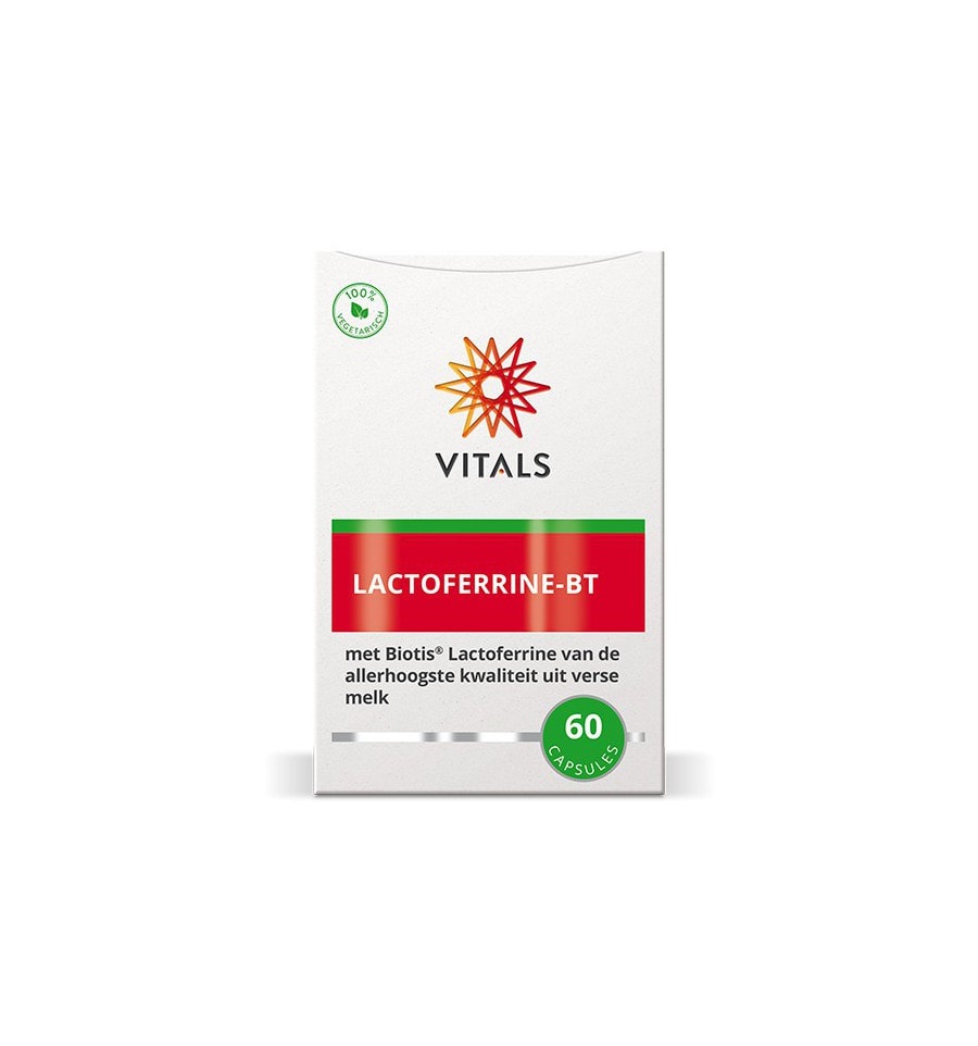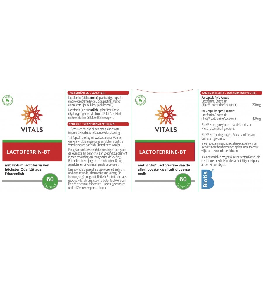 Lactoferrine-BT van Vitals bevat Biotis® Lactoferrine van FrieslandCampina Ingredients. FrieslandCampina is een alom bekende Nederlandse zuivelcoöperatie, maar veel minder mensen weten dat het onderdeel FrieslandCampina Ingredients specifieke ingrediënten uit melk produceert voor kindervoeding, sportvoeding en gezondheidsproducten voor volwassenen, en dat ze ook dé wereldwijde pionier en expert zijn op het gebied van lactoferrine. Waar een klein land al niet groot in kan zijn! Lactoferrine maakt van nature deel uit van onder meer moedermelk en wordt beschouwd als een van de meest waardevolle eiwitten in melk. De uitdaging is om deze kwetsbare stof op een zo voorzichtig mogelijke manier uit zo vers mogelijke koemelk te halen. Alleen dan behoudt het die optimale eigenschappen waar het om bekendstaat. Lactoferrine-BT van Vitals bevat maar liefst 200 mg lactoferrine van de allerhoogste kwaliteit, verpakt in een speciale maagzuurresistente capsule om zeker te maken dat het intact aankomt op de plaats van bestemming.