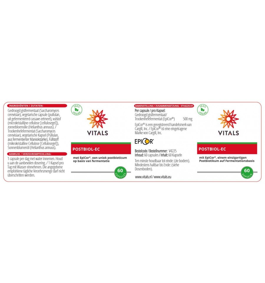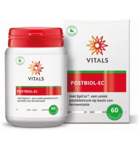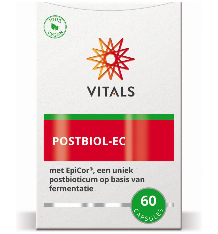 Postbiol-EC van Vitals is een voedingssupplement dat inactieve bakkersgistcellen en metabolieten bevat, waardoor het als een onbewerkt ‘whole food’ fermentaat kan worden beschouwd. Postbiotica zijn stoffen die ontstaan na het fermentatieproces en bestaan uit metabolieten van de micro-organismen. Naast inactieve gistcellen bevat Postbiol-EC onder meer eiwitten, vezels, antioxidanten, mineralen en polysachariden, die bijdragen aan de gezondheid van de darmen en het immuunsysteem. Het supplement kan zowel op zichzelf worden ingenomen als ter aanvulling op een pre- en probioticum.