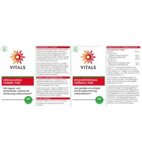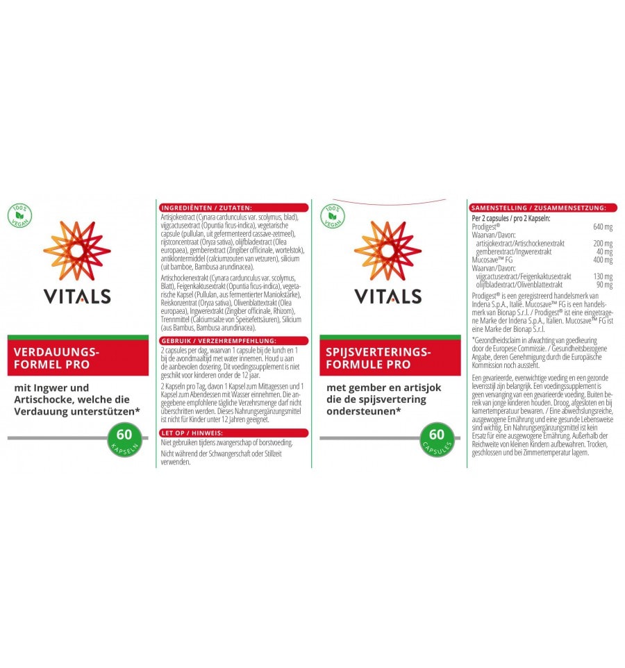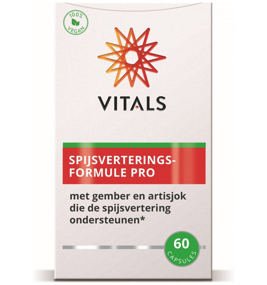 Vitals Spijsverteringsformule Pro is een voedingssupplement dat speciaal is ontwikkeld om de spijsvertering en maagfunctie te ondersteunen. Het supplement bevat twee wetenschappelijk onderbouwde plantenextracten, namelijk Prodigest® en Mucosave™. Deze extracten bevatten onder andere gember en artisjok, bekend om hun gunstige invloed op de spijsvertering en maagfunctie. Daarnaast bevat het supplement een uniek extract uit vijgcactus en olijfblad. Het product is geschikt voor vegetariërs en veganisten. De werking van het supplement wordt ondersteund door humane studies en het is voorzien van (voorlopig) toegestane gezondheidsclaims.