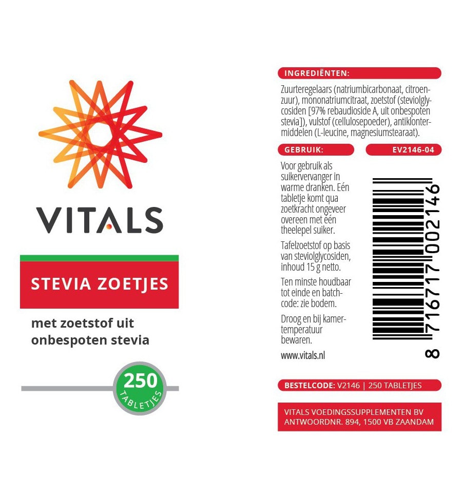 Try Vitals sweeteners with Stevia extract! These sweeteners are made from the purest form of Stevia extract, with no less than 97% rebaudioside A. This provides an intense sweet taste without the bitter aftertaste that you often taste with other Stevia products. In addition, these sweeteners are made from unsprayed Stevia plants and are free from genetically modified organisms.