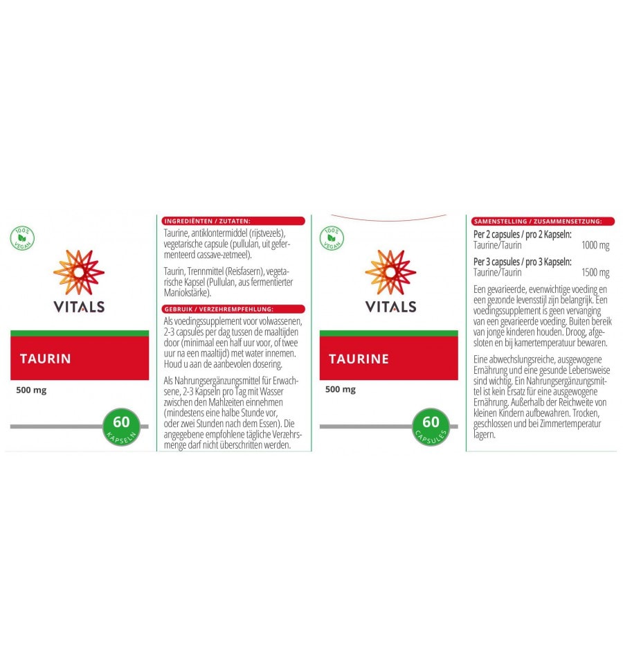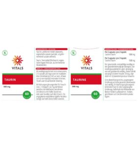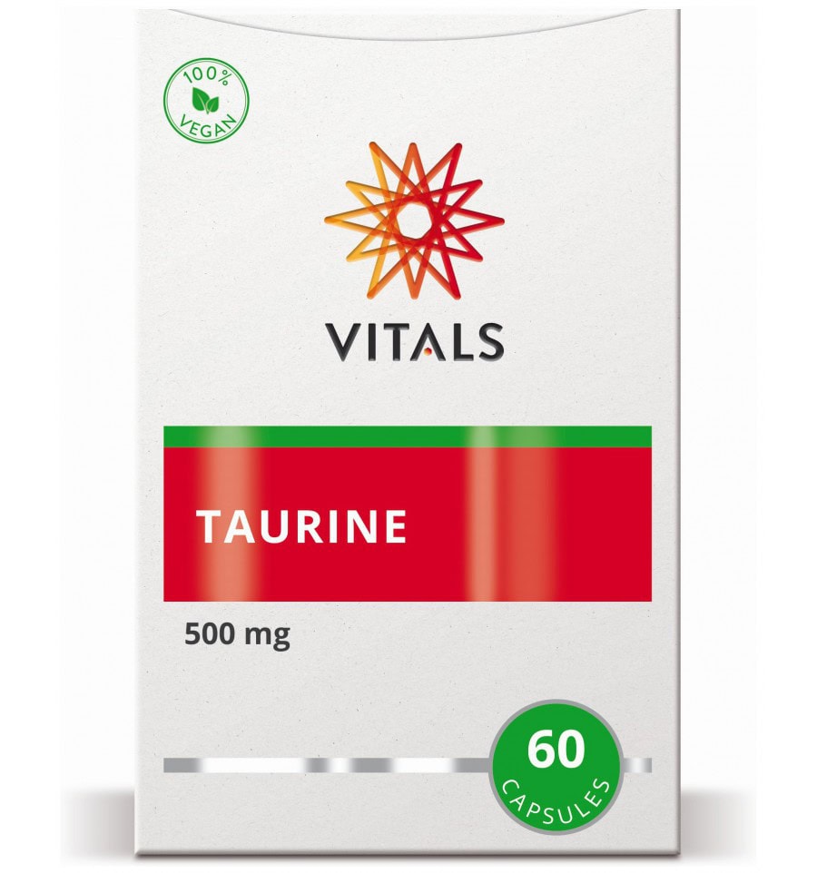 Vitals Taurine Capsules is een voedingssupplement dat per capsule 500 mg taurine bevat. Taurine is een semi-essentieel aminozuur dat essentieel is voor het onderhoud van een gezonde levensstijl. Het wordt veel aangetroffen in het zenuwweefsel, de ogen en het spierweefsel van het lichaam en vervult daar een breed scala aan functies. Taurine is een stofwisselingsproduct van cysteïne en methionine, die allebei zwavelhoudende aminozuren zijn. Hoewel taurine qua biochemische structuur geen echt aminozuur is, wordt het wel tot de aminozuren gerekend.
