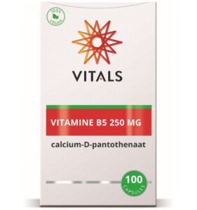 Vitals Vitamine B5 250mg is een voedingssupplement met een hoge dosering vitamine B5 in zuivere vorm. Vitamine B5 komt voor in diverse voedingsmiddelen, maar soms kan het lastig zijn om voldoende binnen te krijgen. Een supplement kan dan een goede optie zijn om aan de dagelijkse behoefte te voldoen. Het supplement is aangevuld met een hulpstof uit natuurlijke bron en zit in een plantaardige capsule. De capsule is gemakkelijk in te nemen en geschikt voor veganisten.