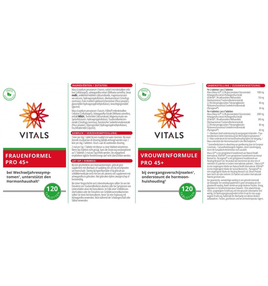 Maca (Lepidium peruvianum Chacon), vulstof (microkristallijne cellulose [cellulosegel]), ashwagandha-extract (Withania somnifera, bevat melk), monnikspeperextract (Vitex agnus-castus), antiklontermiddelen (siliciumdioxide, magnesiumzouten van vetzuren, hydroxypropylcellulose), glansmiddel (hydroxypropylmethylcellulose), saffraanextract (Crocus sativus), bevochtigingsmiddel (glycerol).